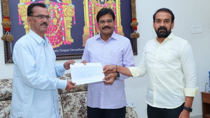 The contribution was made by the Society’s Chairman, B. Ramakrishna, who handed over a Demand Draft to TTD Deputy Executive Officer (Annaprasadam) Rajendra Kumar on Sunday evening at the Additional EO Camp Office in Tirupati.
