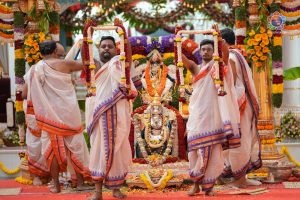 A remarkable highlight of this year’s celebrations was the collective expression of devotion through bakshanam samarpanam, wherein over 300 varieties of sacred food offerings were lovingly prepared and offered by devotees from the states of Telangana and Karnataka.