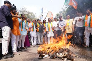 Hyderabad, Mar 14 (TNT):  Condemning Rahul Gandhi’s alleged violation of parliamentary rules and accusing Congress MPs of insulting democracy, Telangana BJP leaders, led by state president N. Ramchander Rao, burnt an effigy of the Congress leader in front of the party’s state office here on Saturday.